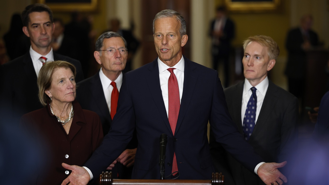 Senate Majority Leader John Thune, R-S.D., and other members of Senate GOP leadership spoke with reporters in the Capitol on Tuesday afternoon. Kevin Dietsch/Getty Images North America hide caption toggle