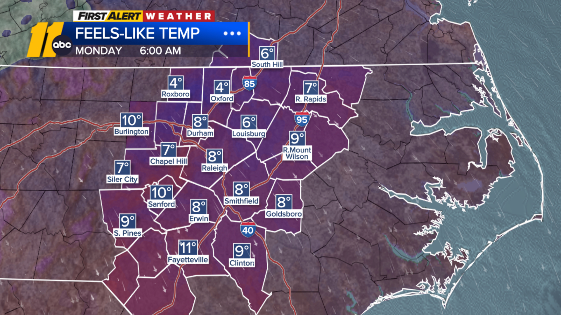 RALEIGH, N.C. (WTVD) — Arctic air plunged temperatures into the teens with widespread wind chills in the single digits expected through mid-morning Monday.