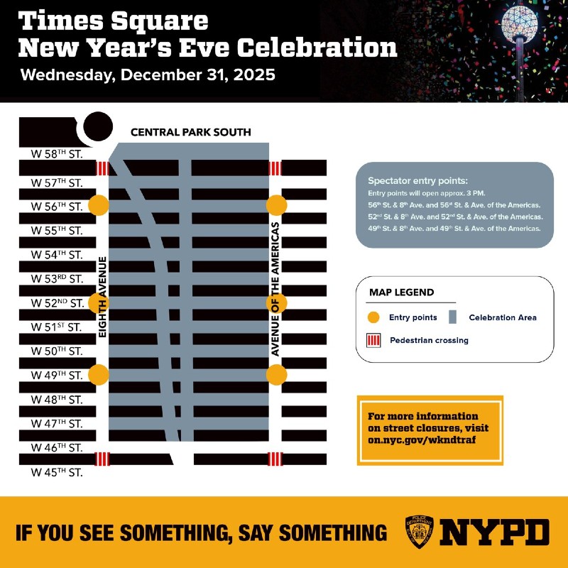 Pedestrian entry is permitted only via 6th or 8th Avenues – once streets close, crossing Broadway/7th Ave isn’t allowed.