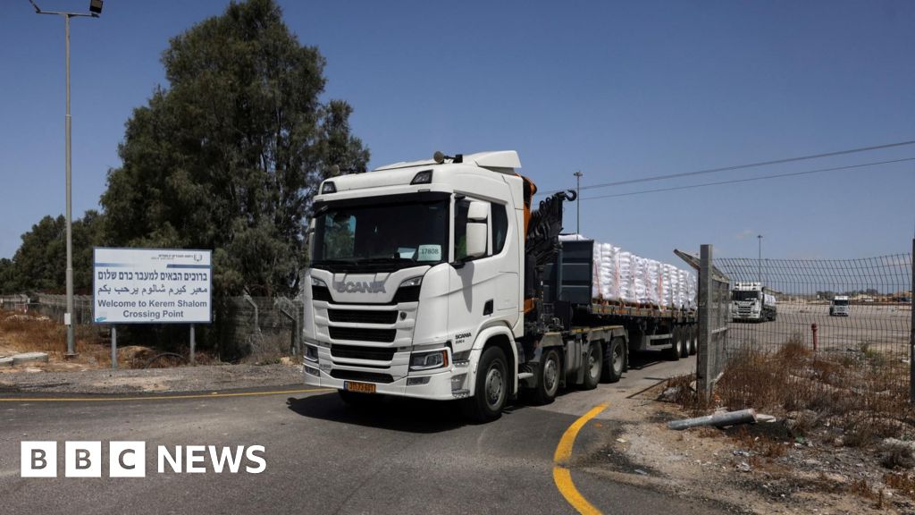 Reuters Aid lorries were photographed arriving at the Israeli-controlled Kerem Shalom crossing with southern Gaza on Monday morning Israel says it has allowed five UN lorries carrying humanitarian aid, including