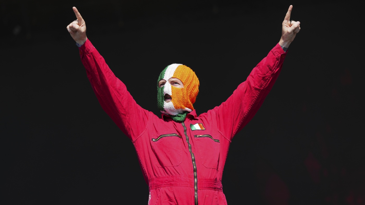 J. J. O Dochartaigh from the hip hop trio Kneecap performs during the Glastonbury Festival in Worthy Farm, Somerset, England, Saturday, June 28, 2025. Scott A Garfitt/Invision/AP hide caption toggle