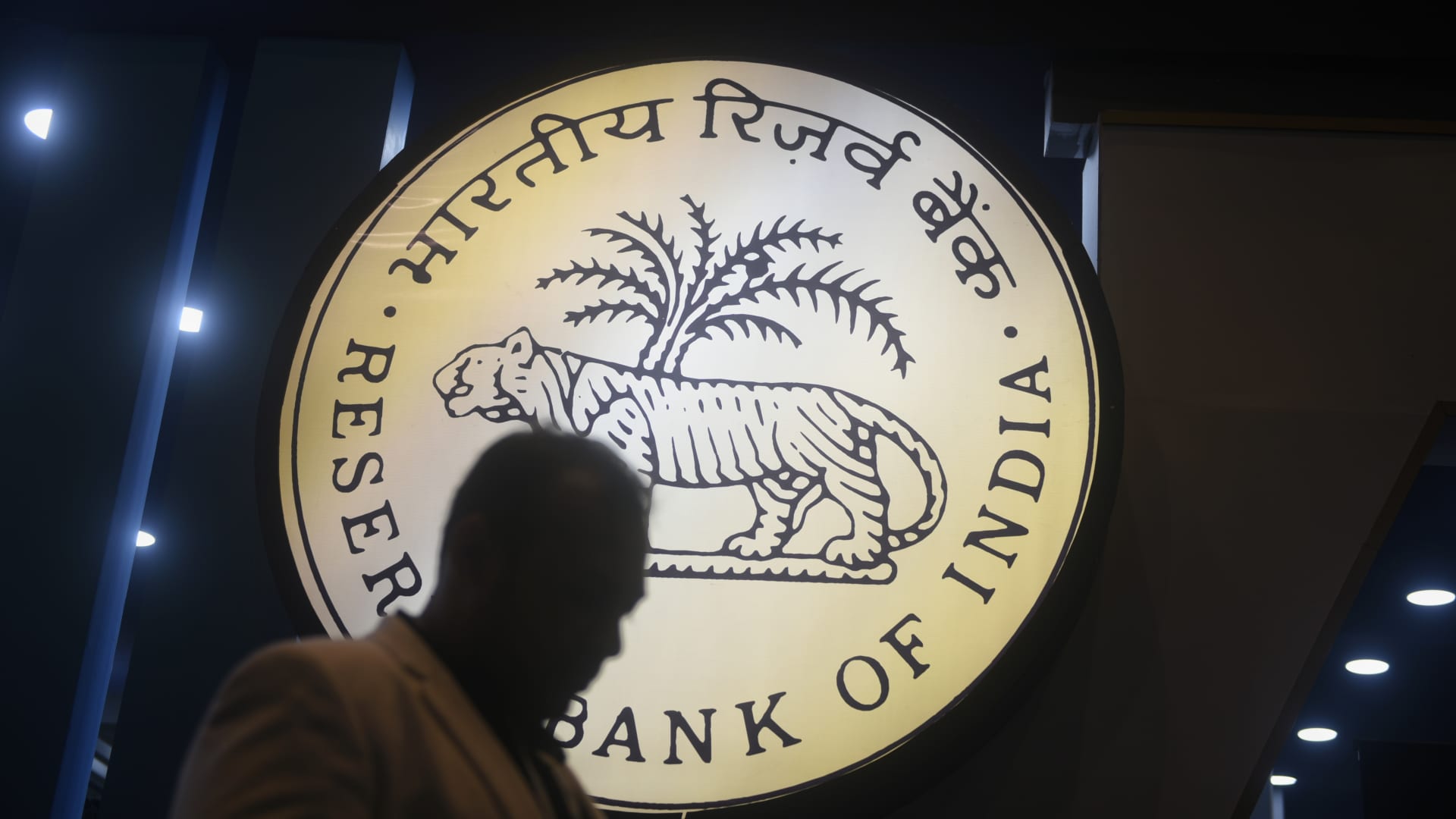 People walk past Reserve Bank of India signage in front of an installation stall at Global Fintech Fest in Mumbai, India, on Aug. 28, 2024. Indranil Aditya | Nurphoto |