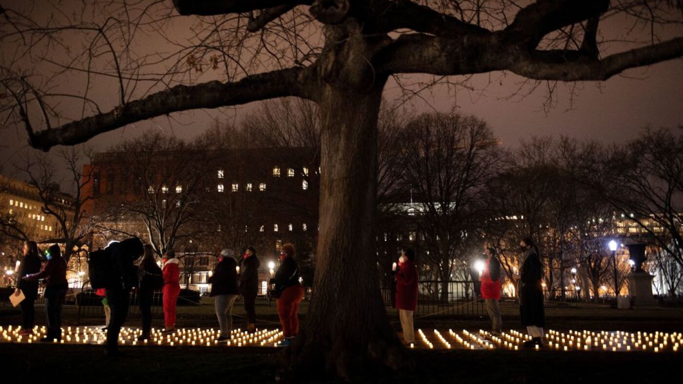 Activists gather during a vigil in Lafayette Park for nurses who died during the COVID-19 pandemic on January 13, 2022, in Washington, DC. (Photo by Brendan Smialowski / AFP) (Photo