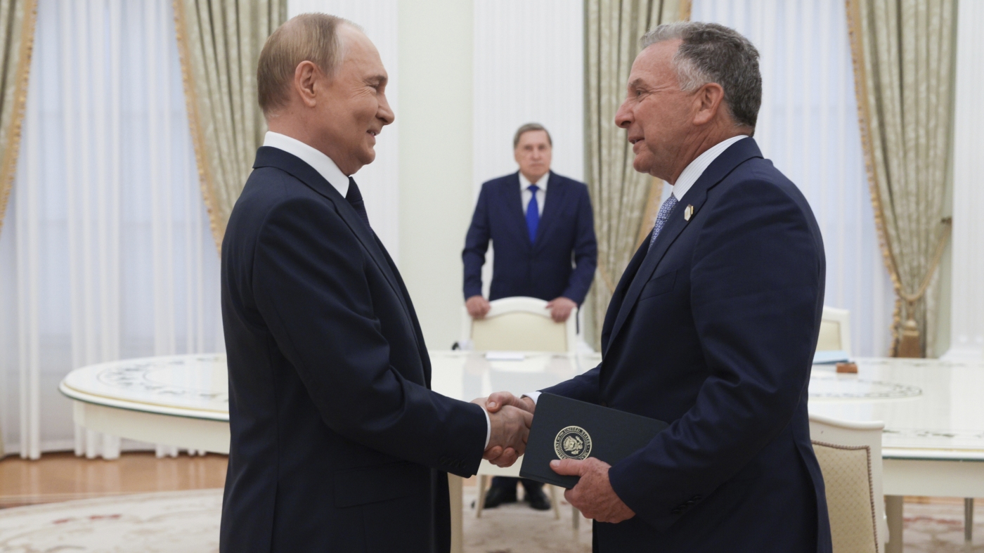 Russian President Vladimir Putin (left) and U.S. special envoy Steve Witkoff shake hands during their meeting in Moscow, Wednesday. Gavriil Grigorov/Sputnik/Kremlin Pool Photo via AP hide caption toggle caption Gavriil