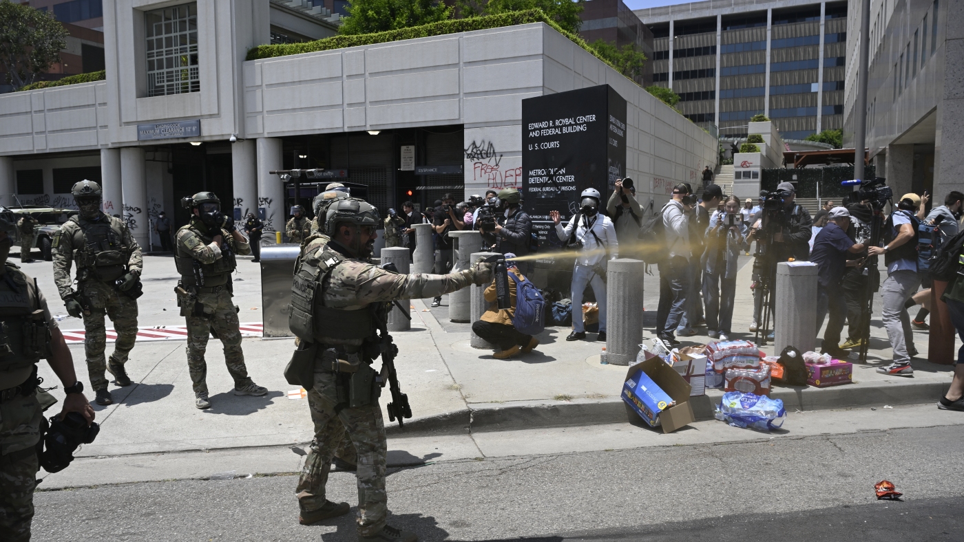 Federal agents and National Guard troops confront protesters outside the downtown Los Angeles federal building on June 8, 2025. In a lawsuit challenging the Trump administration’s immigration crackdown in Los