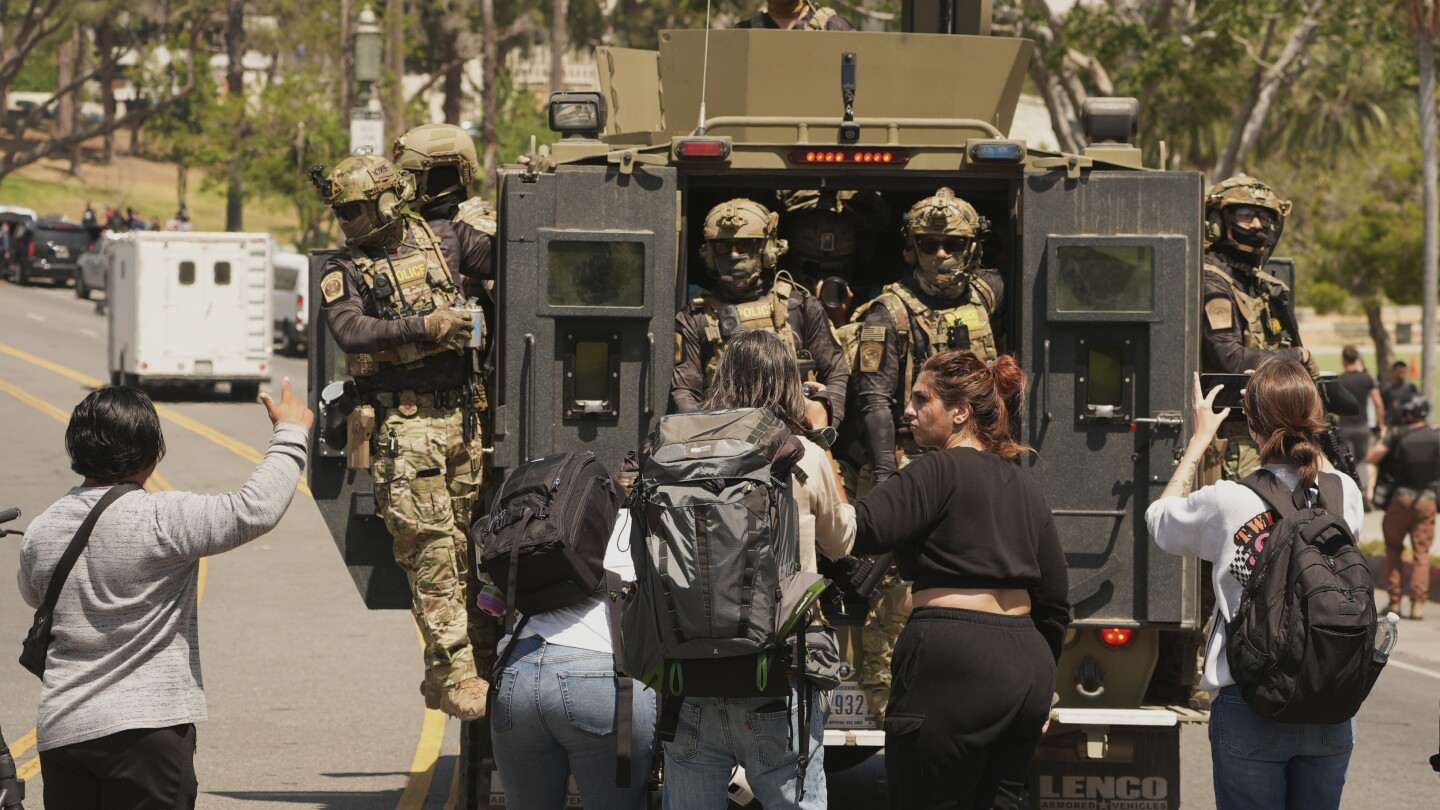 LOS ANGELES (AP) — Federal officers and National Guard troops fanned out around a mostly empty Los Angeles park in a largely immigrant neighborhood on foot, horseback and military vehicles