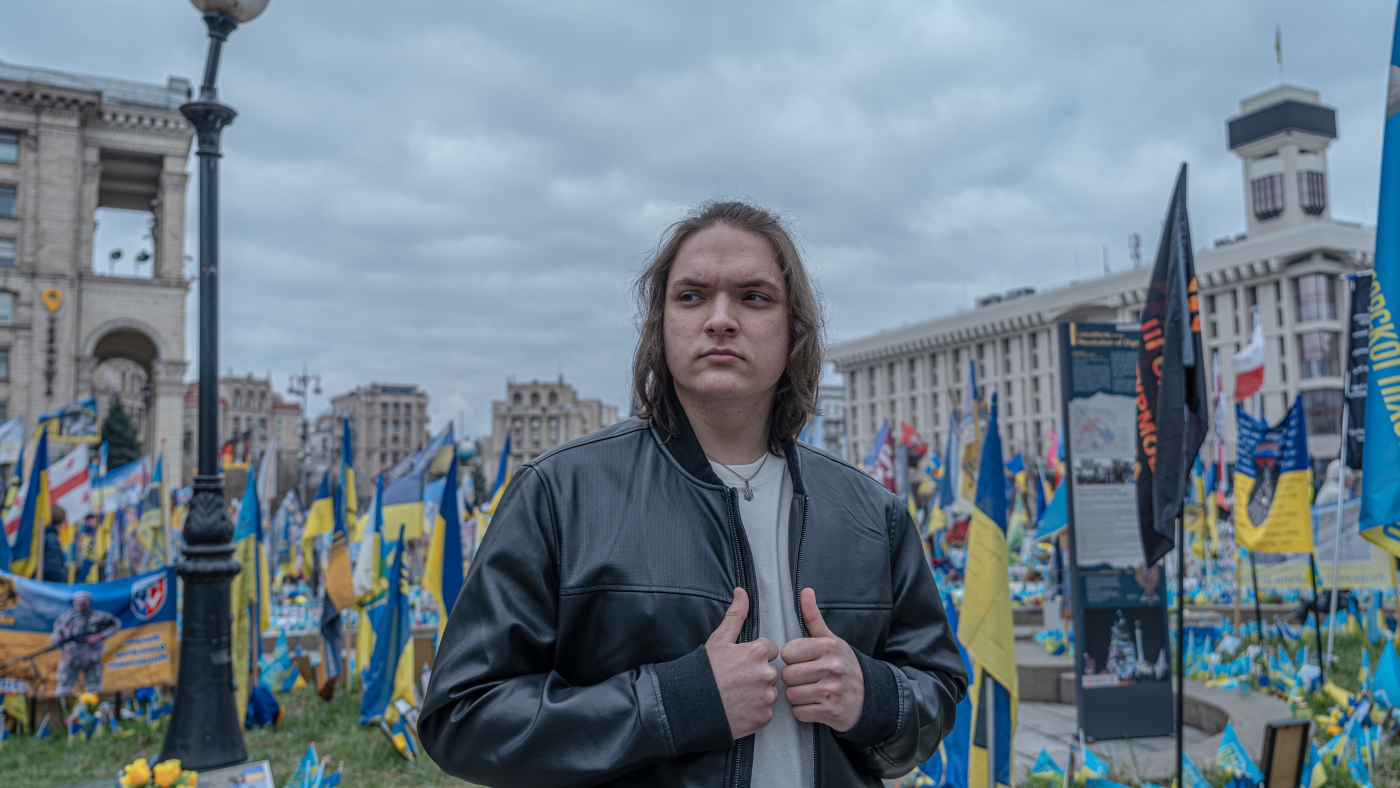 Ivan Sarancha, 18, who left Luhansk after 11 years of living under occupation, stands in front of a memorial for the fallen at Maidan Square — where the pro-Europe uprising