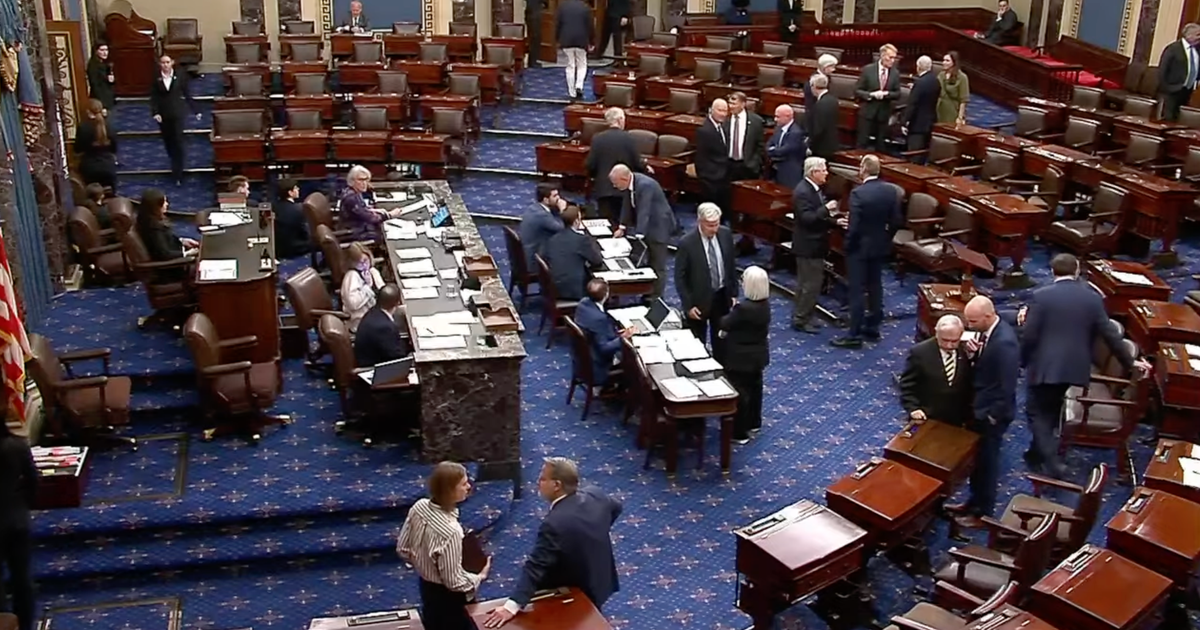 Senate Majority Leader John Thune of South Dakota holds a copy of a continuing resolution as he speaks alongside House Speaker Mike Johnson of Louisiana in Statuary Hall at the