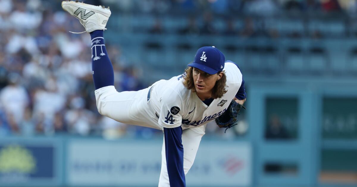 Blue Jays take lead on Alejandro Kirk’s three-run home run Dodgers pitcher Tyler Glasnow reacts after giving up a three-run home run to Toronto’s Alejandro Kirk in the fourth inning.